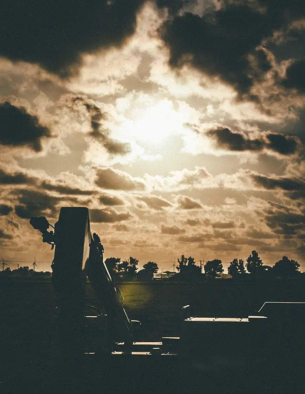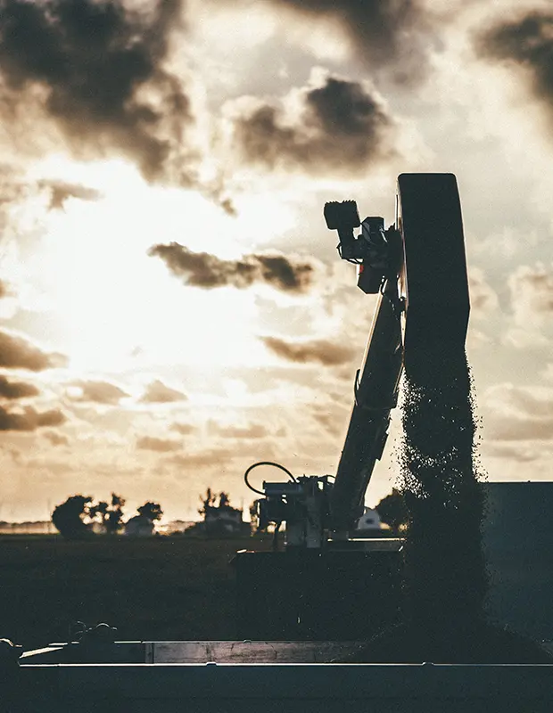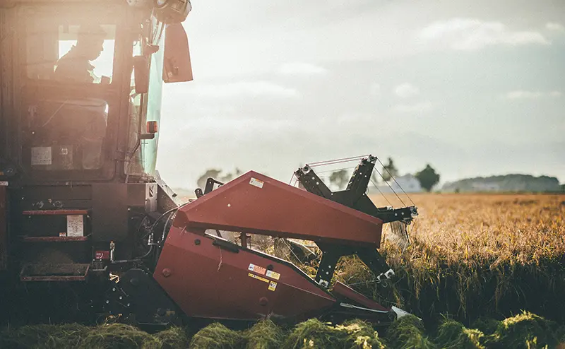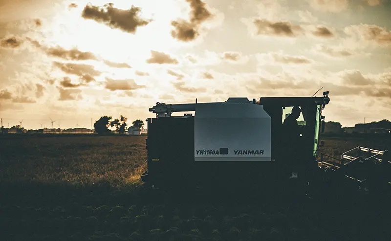 夕焼けの中、稲穂を刈り進める雄一さん愛用のコンバイン。