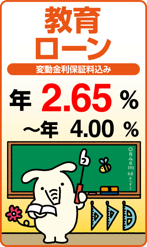 - 教育ローンは、就学確認書類(「在学証明書」、「合格通知書」、「学生証写」、「授業料等納付通知書」等)が別途必要となります。