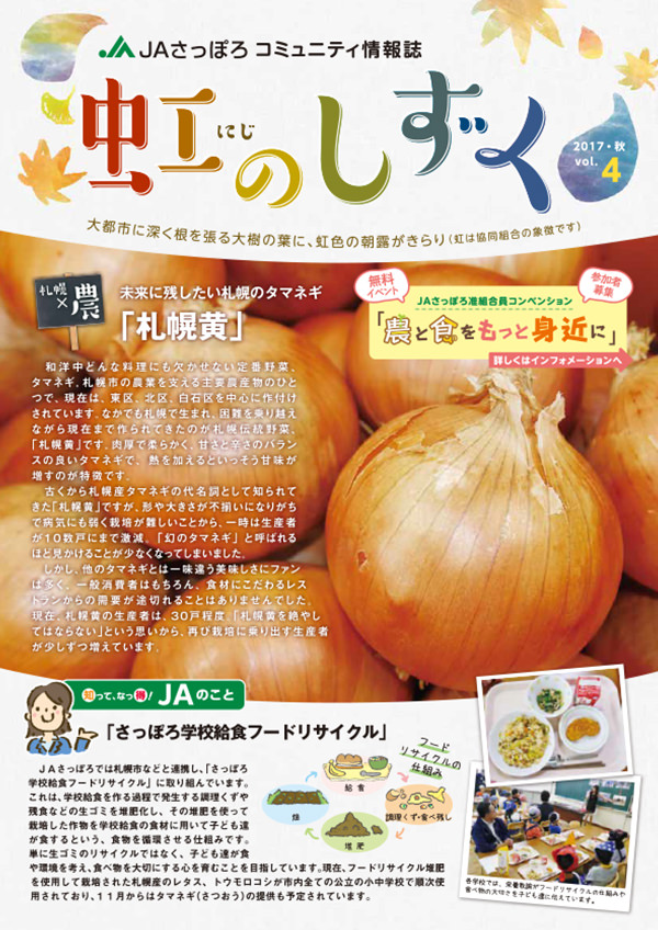 「虹のしずく」は、准組合員及びJAさっぽろをご利用の皆様へ向けたコミュニティ情報誌。 札幌の農業、農産物情報、JAのイベントやお得な情報を掲載しています。 各支店窓口にも備え付けておりますのでご覧下さい。