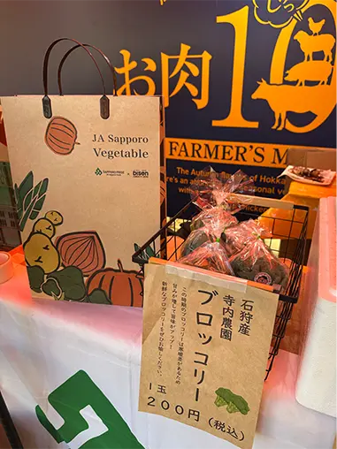 bisenの学生がデザインした紙袋も大好評!生産者の情報が記載されたポップで、地元野菜の魅力もお伝えしました。