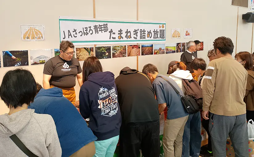 青年部によるたまねぎ詰め放題コーナーでは、北札幌地区と篠路地区の部員が丹精込めて育てた玉ねぎ480kgを用意。青年部員の皆さまが丹精込めて育てた玉ねぎは、大好評!開始早々から多くのお客さまが詰め放題を楽しみ、積み上げられた玉ねぎは次々と売れ、開始からわずか1時間で完売となりました。