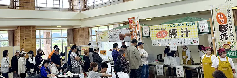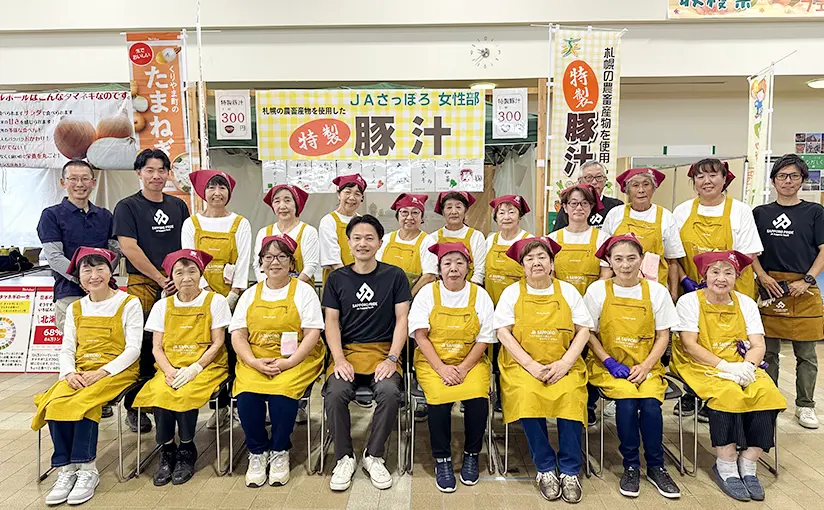 女性部の特製豚汁は、「札幌近郊で美味しい農畜産物が生産されていると知ってほしい」との想いから、札幌黄や札幌白ゴボウなど、札幌産の食材にこだわって調理。